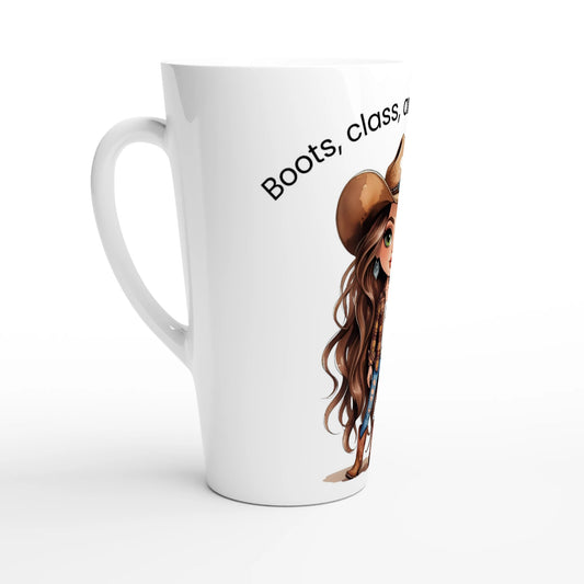 Boots, Class And A Little Sass - White Latte Mug – Personalized 17oz Ceramic Coffee Cup
