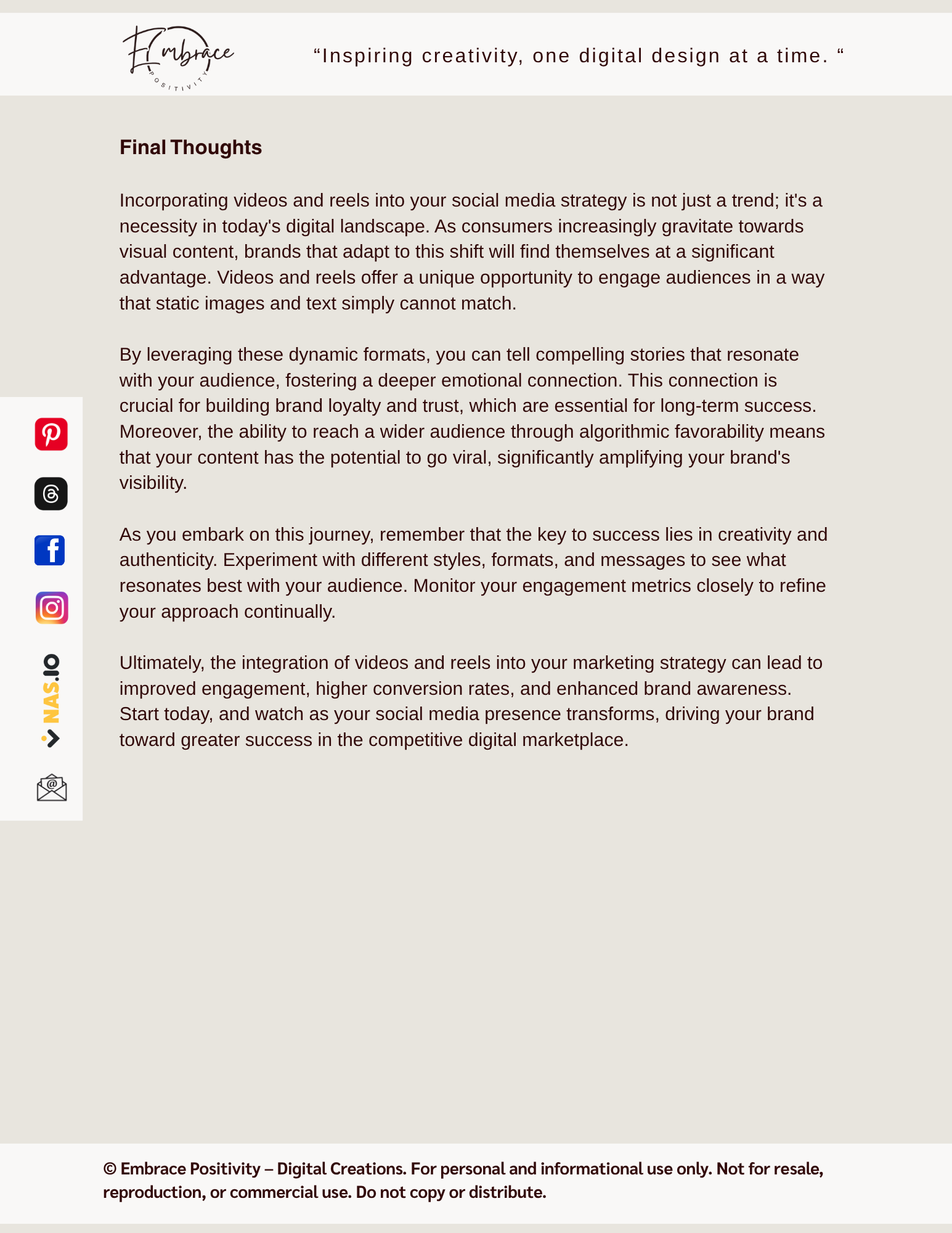 Incorporating videos and reels into your social media strategy is no longer optional; it's essential. With their ability to engage, inform, and convert, these formats can significantly enhance your online presence and drive business success. Start experimenting with video content today to see the difference it can make for your brand!