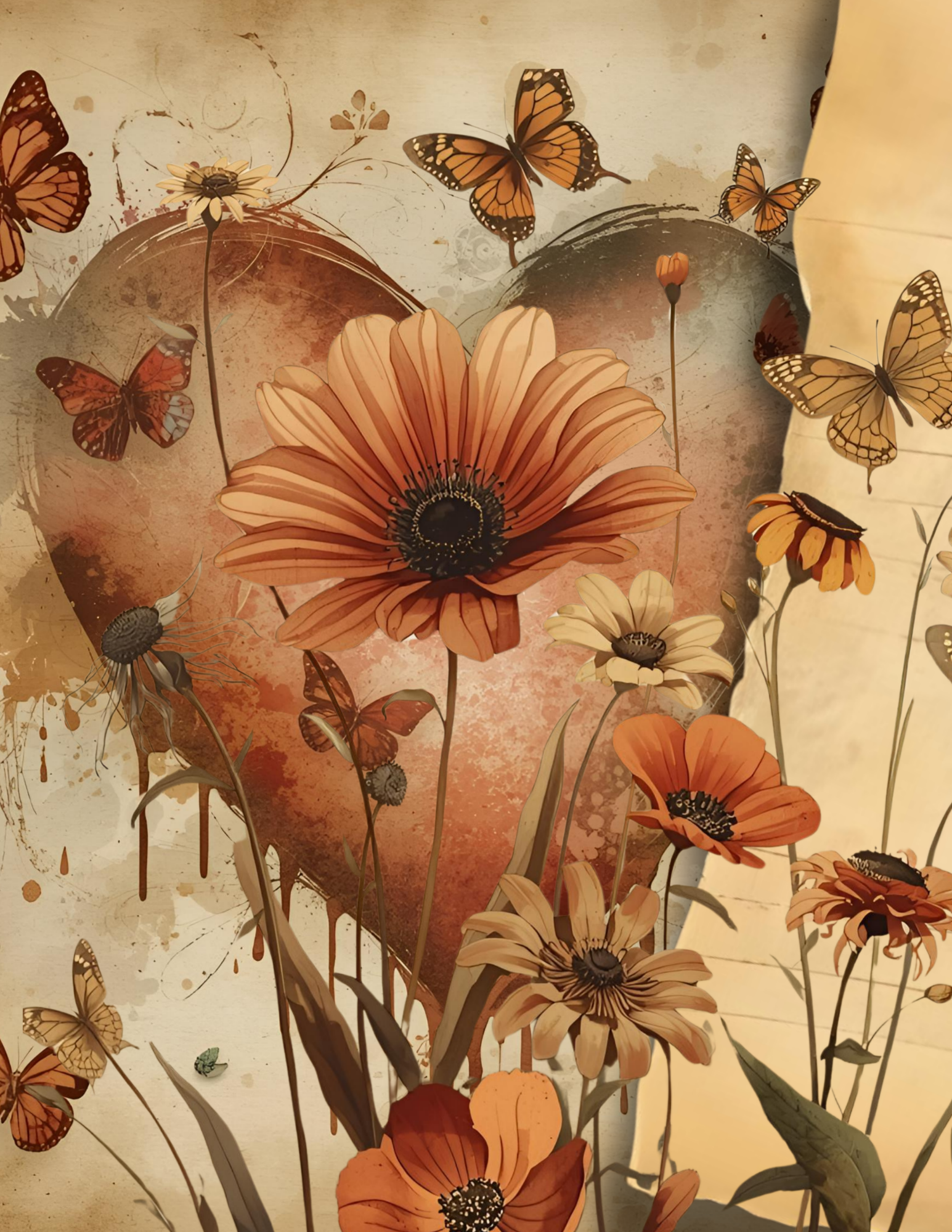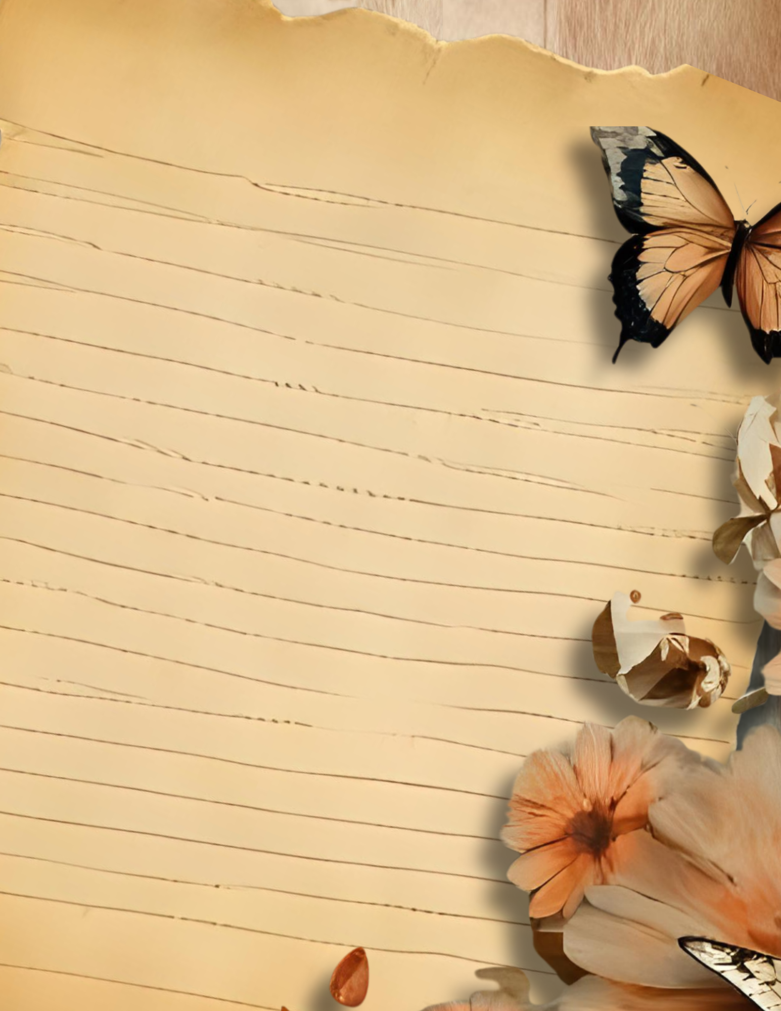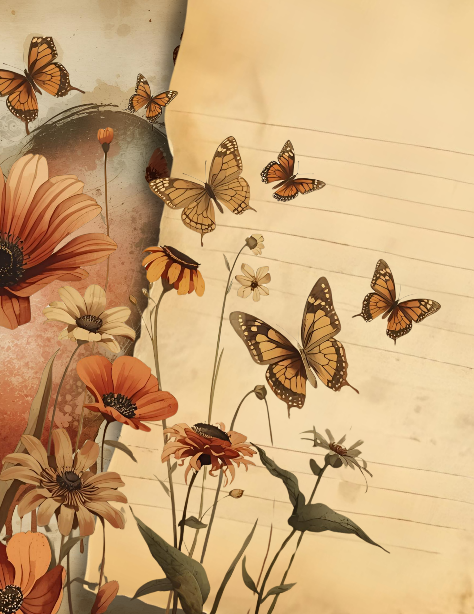 Each page is adorned with delicate floral illustrations, fluttering butterflies, and graceful birds—blending nature’s beauty with a whimsical, old-world charm. The aged paper texture adds warmth and personality, making every page feel like part of a treasured keepsakes.