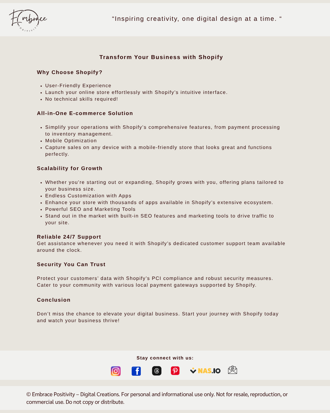 - All-in-One E-commerce Solution: Why juggle multiple tools when Shopify offers everything you need in one place? From payment processing to inventory management, Shopify simplifies your operations, allowing you to focus on what truly matters—growing your business.